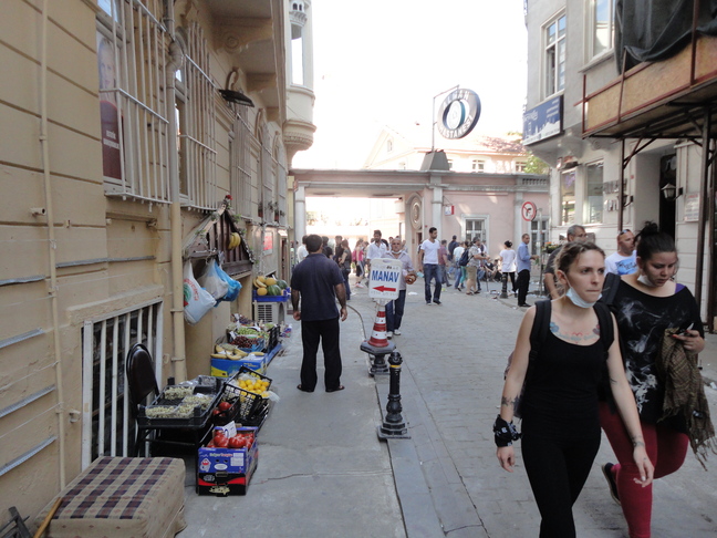 We somehow made our way through the crowds to Sıraselviler (“Cypress Row”) Caddesi. Away from Taksim, this road becomes lined with tree-shaded sidewalk cafes. It runs down to Tophane, the old Ottoman cannon foundry that is now an exhibition space for our fine-arts university. But we did not walk that far. We took side streets of Cihangir over to İstiklal (“Independence”) Caddesi.