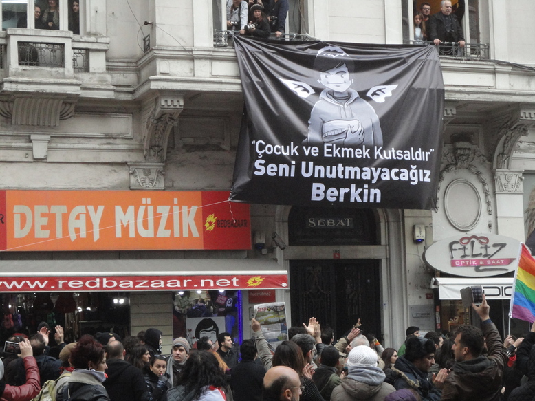 Above the stone in the sidewalk where Hrant Dink’s body had lain, this banner said, “A child and bread are holy. We shall not forget you, Berkin.”