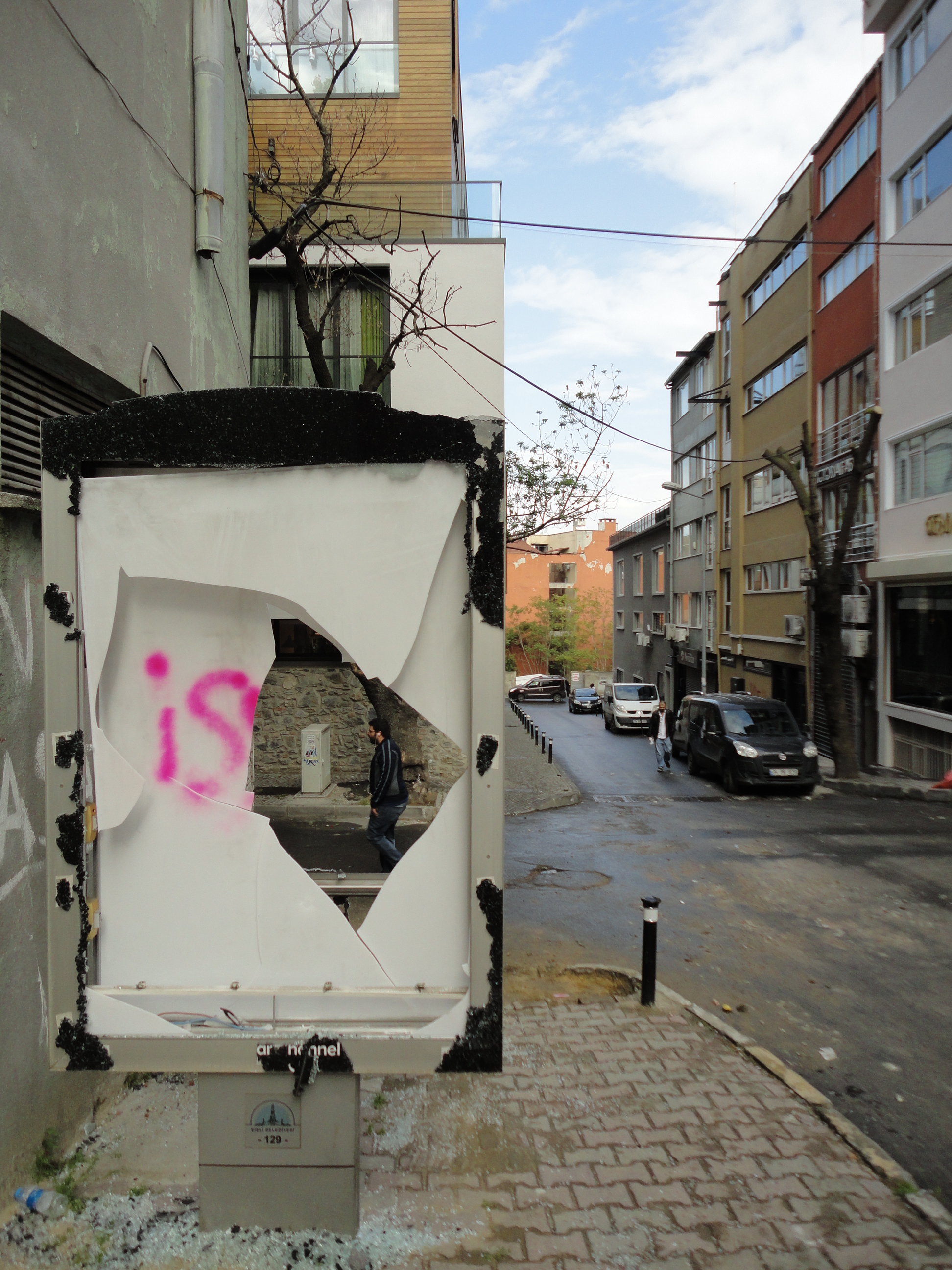 An advertising display was also smashed. These things represent a theft of public space. The sidewalks are too narrow as they are.