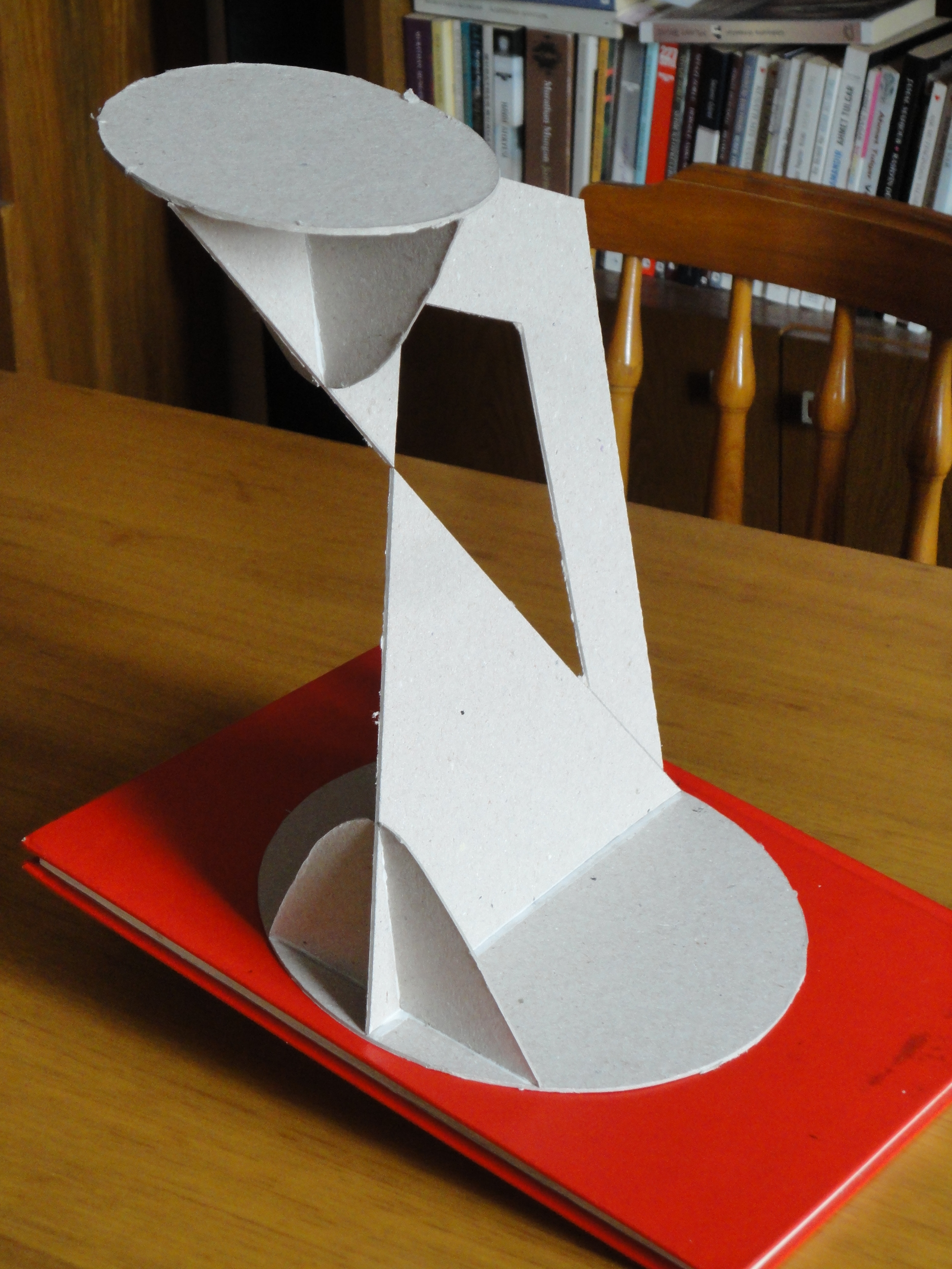 The cardboard strut in the model is probably not the best way to hold the axial triangles together. The strut is not strong enough to keep the two triangles in the same plane unless that plane is vertical; and holding the plane vertical requires tilting the bases of the cones.
