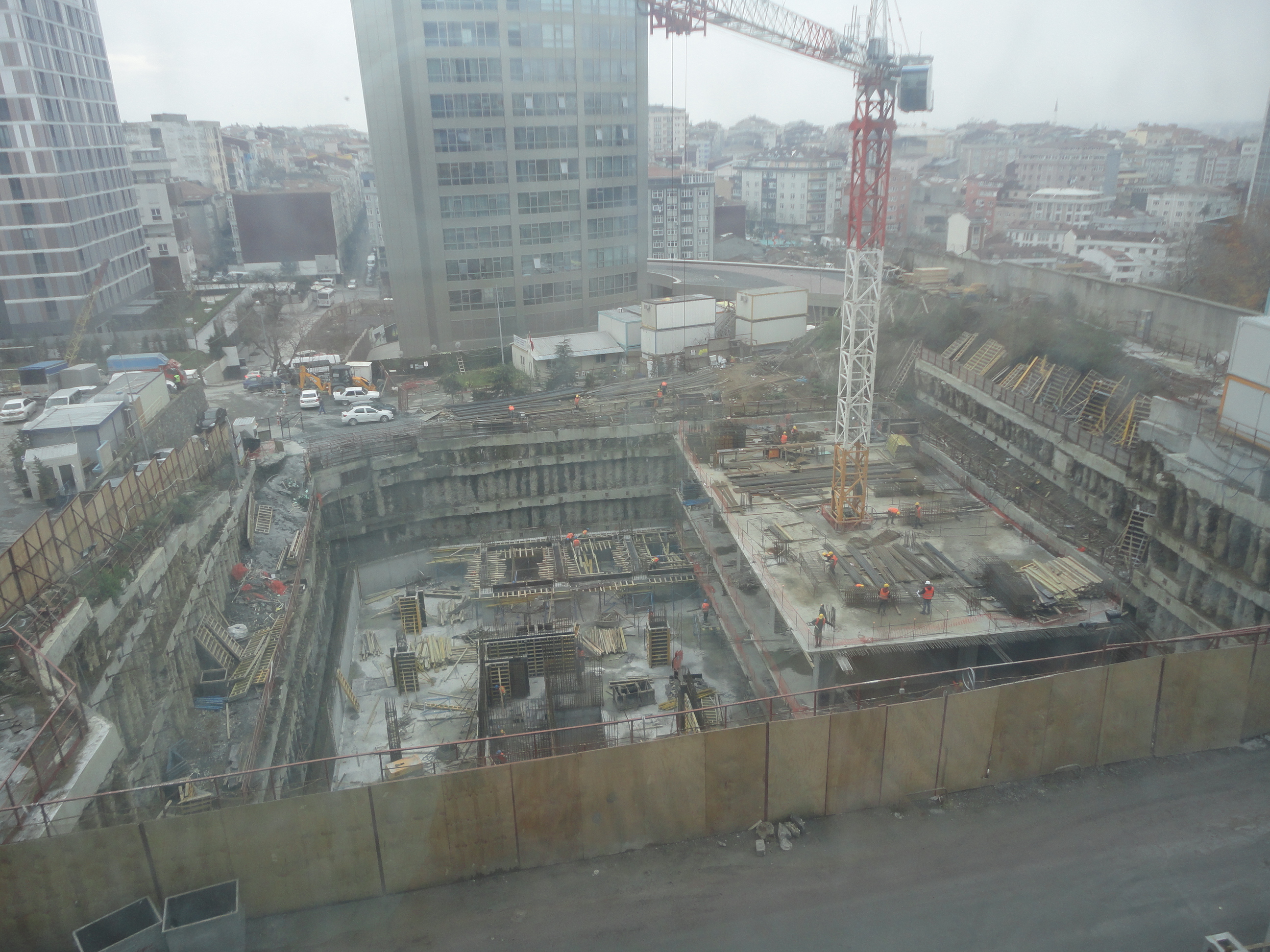 We can hear noise from the school construction site at any time of day. Trucks are loaded with dirt in the middle of the night, perhaps because the roads are clear then, so the dirt can be hauled away. Supposedly work in the morning should not start before 8:30, but often the hammering starts around 8:00. We hope it really is a school they are constructing, and not a block of flats. So far, the foundation does not seem to be elaborate enough for a real high-rise, like the foundation in the next photo here behind our university building in Bomonti.