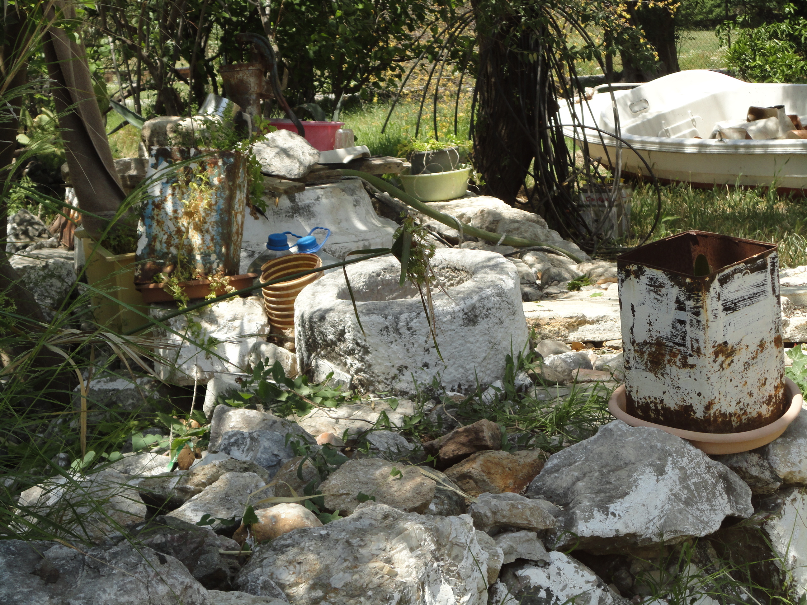 There were primitive residential or agricultural compounds here and there among the ruins of Teos. At one of these compounds, stones from the old city seemed to have been gathered and painted white (along with a large cheese tin).
