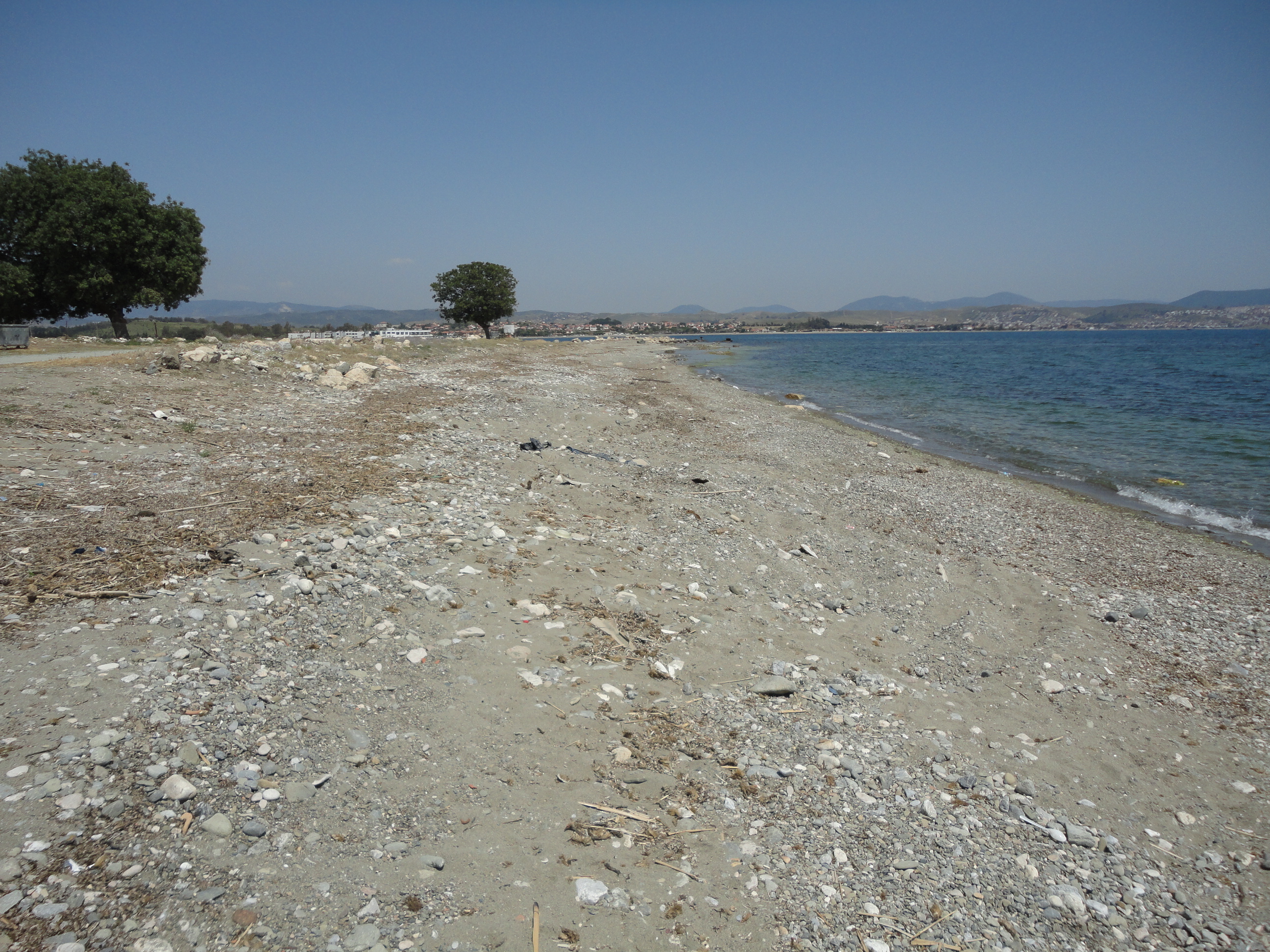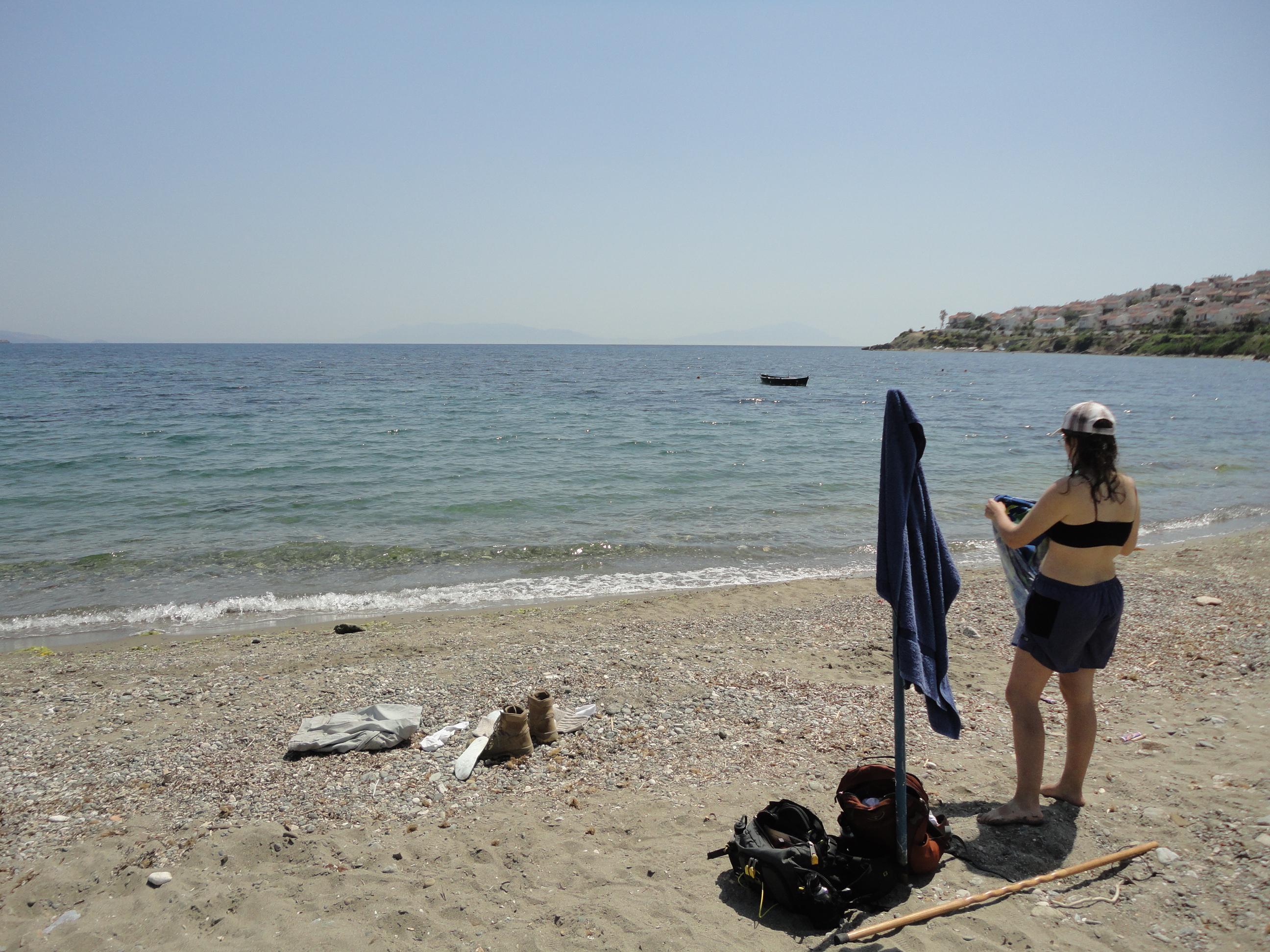 We arrived in Sığacık at midday on Saturday, May 16, 2015. We had taken an overnight bus from Istanbul to Izmir, then the bus company’s minibus service to Üçkuyular, then a dolmuş to Seferihisar, and finally another dolmuş to Sığacık. The best place to swim in Sığacık was apparently over the hill to the west, at Akkum (“white sand”). The dolmuş from Seferihisar continued thither, but we just walked after leaving our things at the pension. You could supposedly get to the ruins of Teos by turning off the road to Akkum. A sign pointed the way, but the Teos road was lined with new cottages overlooking the beach, and the ancient city itself did not seem to be near; we just went back to the main road and down to the beach.