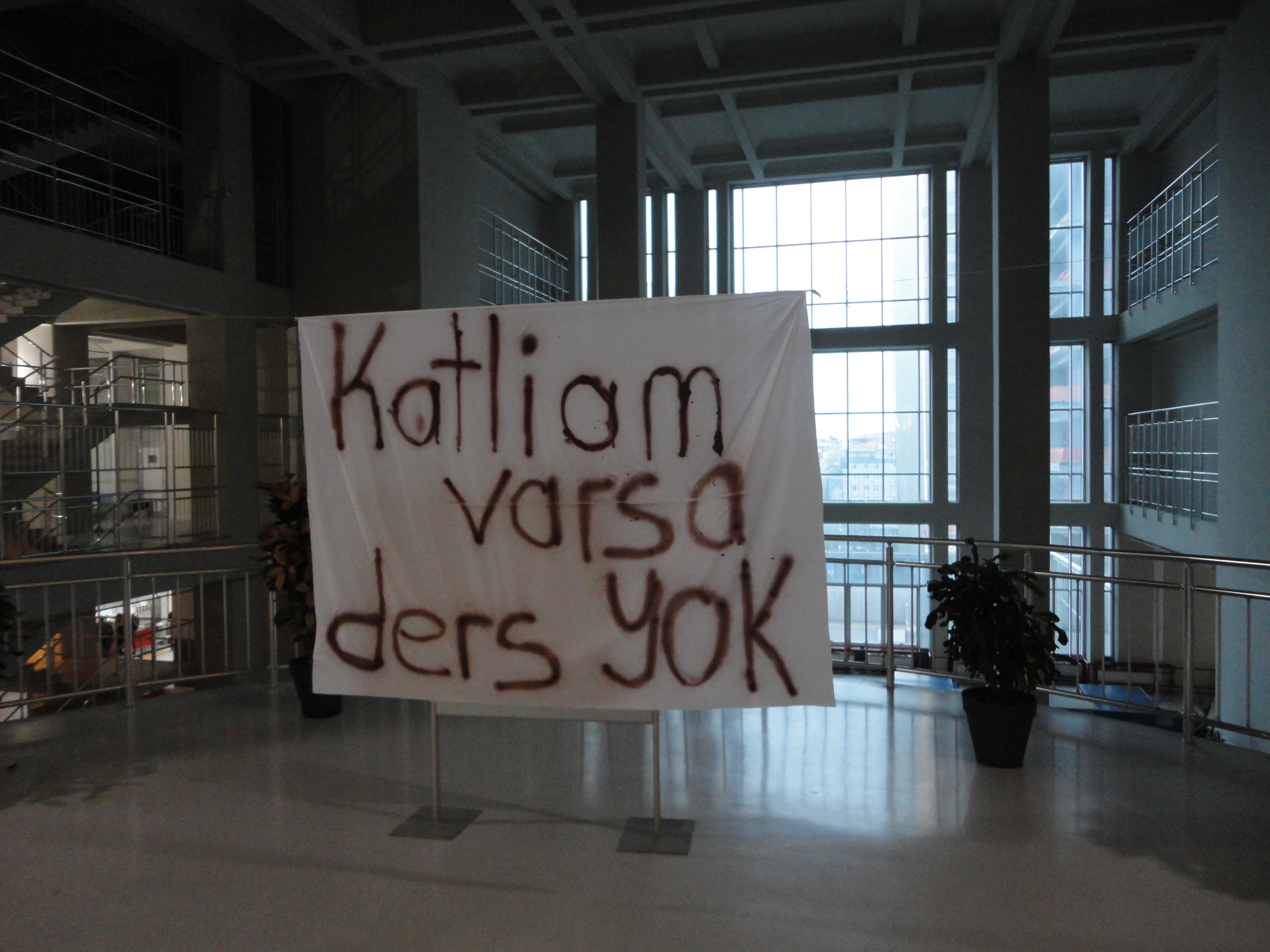 Katliam varsa ders yok. Yani (bence) katliam varsa, ders olmamış olmalıdır, çünkü gerçek derslerde savaş yoktur, ve tek kavga bilinmeyenlerledir. // “When there is a massacre, there is no class.” That is to say (in my interpretation), when there is a massacre, there must not have been class, because in real classes there is no war, and the only struggle is with the unknown.