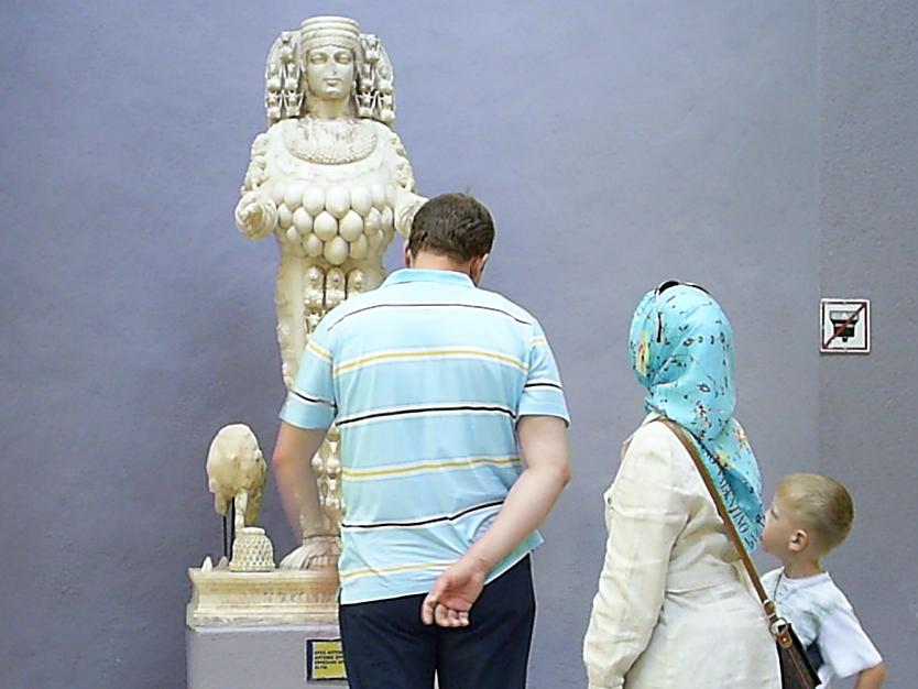 After lunch, Ayşe had a meeting, concerning the the delicate situation of herself and a thousand other Turkish academics; but I visited the Elgiz Museum, at the İTÜ-Ayazağa metro station. I had never visited this private museum, and I knew of it only from a display at the last Contemporary Istanbul art fair. At the Elgiz Museum, the works of a new exhibit were on the walls, but not the labels. In one of these works, a photograph, the objects dangling from a woman’s necklace were testicles, by my guess. I take these as an allusion to ancient statues of Artemis, from the temple in Ephesus, by the seaside below Şirince. Across the bosom of Artemis hang globules that are said to be testicles. Probably they are bull testicles. However, in a passion for chastity, such as was shown by Hippolytus in the tragedy by Euripides, perhaps a devotee of the goddess would offer up the testaments of his own virility, in an act of self-castration.