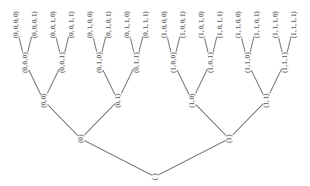 The Binary Tree has branching points, which we may call nodes. Each node is labelled with a different finite sequence of zeros and ones. There is a root node, labelled with the empty sequence, ( ); the height of this node is 0. The root is followed by the nodes (0) and (1), having height 1. These nodes are followed respectively by nodes of height 2: (0), by (0,0) and (0,1); (1), by (1,0) and (1,1). Then come nodes of height 3, and so on. We can compare the heights of two different nodes, since heights are natural numbers, and these are linearly ordered. However, different nodes can have the same height. A node itself is above another if its label has the label of the other as an initial segment. Thus (0,1,1) is above ( ), (0), and (0,1), but not above (1,1).