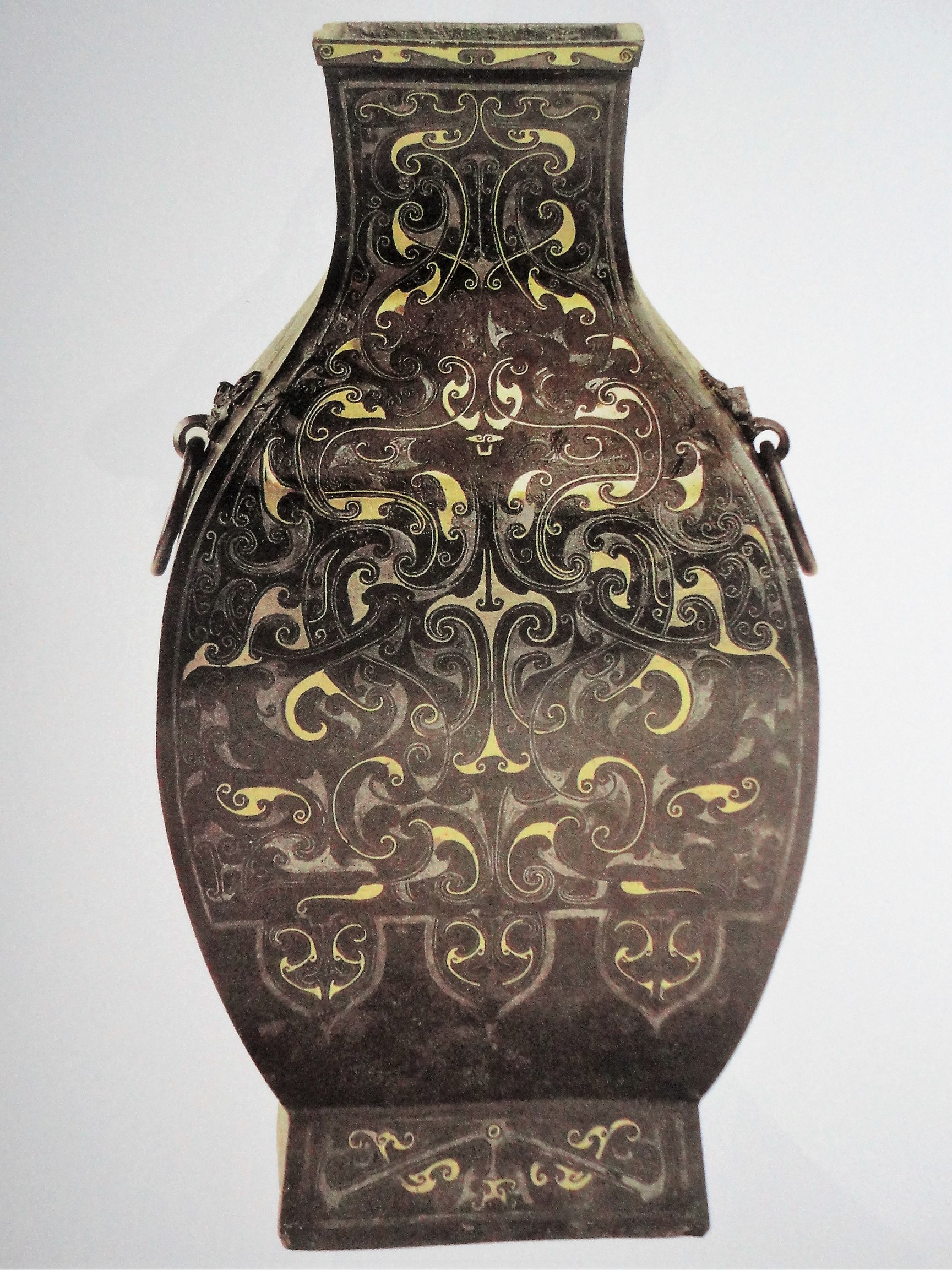 [On the left, the Battersea Shield, dredged from the Thames River in 1857, now in the British Museum. On the right, a hu or ritual vessel, said to be from the Zhou or Han Dynasty in China, now in the Victoria & Albert Museum, although I could not confirm this online; I photographed the page of 30,000 Years of Art (London: Phaidon, 2007) where the vessel appears, opposite the Battersea Shield. Both objects are dated to around 200 BCE]