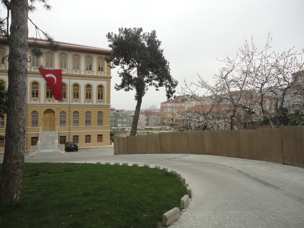 The original Darüşşafaka school building sat for years with a canopy over it, pending restoration. Now the work seems to have been done. The guard did not let us far into the grounds. I centered a photograph on the distant Süleymaniye Mosque, the masterpiece of Sinan’s middle age. The masterpiece of his maturity is the Selimiye Mosque, which Ayşe and I visited last year in Edirne.