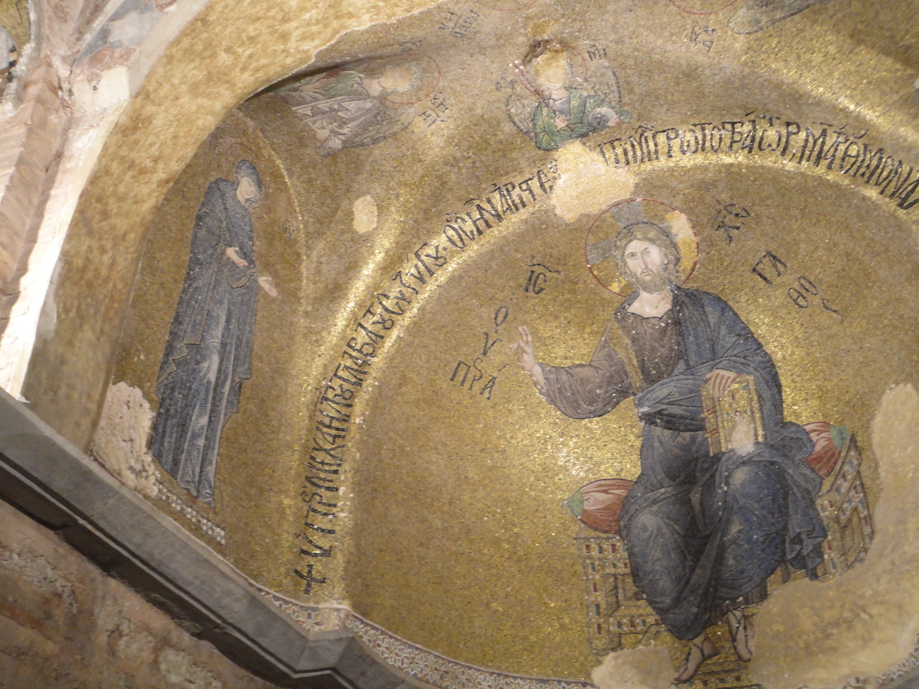A longer walk brought us to the former Church of the Holy Saviour in Chora, now all covered up on the outside. The nave is closed, but we toured the mosaics of Mary and Baby Jesus in the two narthices, and the fresco of the Harrowing of Hell in the parecclesion.