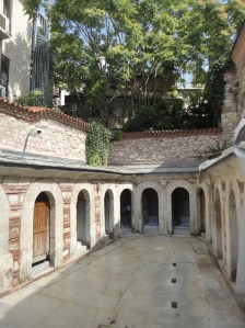 I had toured the Seventh Hill in 2013 with a friend. I had no clear plan this time, but when I left home Sunday morning, I decided to get on the subway, and I got off at Vezneciler, where the tour described in my last post had begun. Wandering, I encountered the Çukur Çeşme Hanı, the khan (the inn, the caravanserai) of the sunken fountain. The shops sold clothing, but were closed on a Sunday. However, a man and a woman were in the first courtyard. The woman in particular seemed to want to help me; but all she could find to say in English was “English?” I explained in Turkish that I was just looking around.