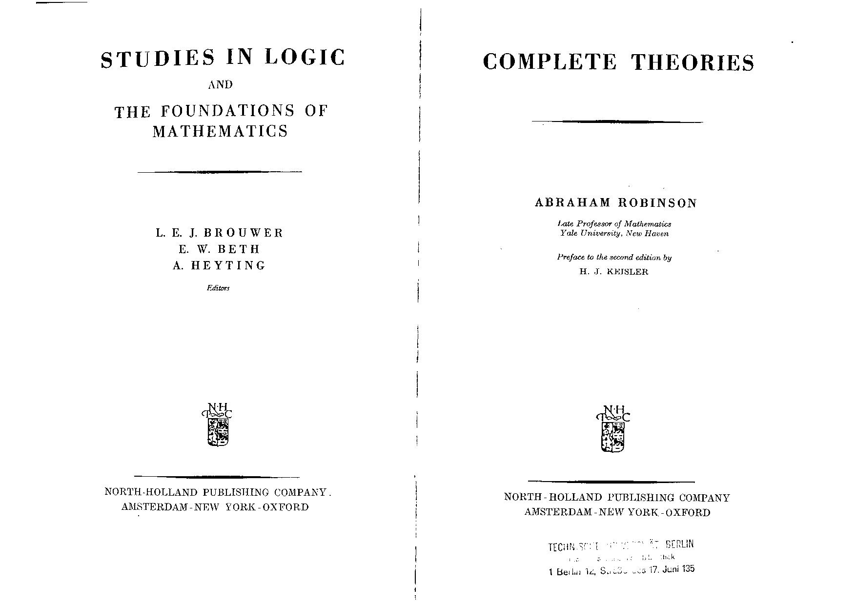 By contrast, Presburger gave, in 1929, a recursive axiomatization of the complete theory of (N, +); Skolem gave, in 1930, the same for (N, ×). Since then, many decidable complete theories have been found. They are the subject of Abraham Robinson’s 1956 book Complete Theories, and they are a subject of model theory, which again is that branch of mathematical logic that I happen to specialize in.