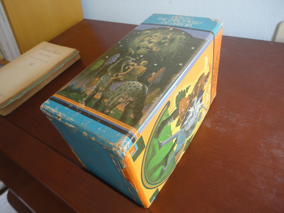 After reading library copies, I bought for myself a boxed set of the Chronicles of Narnia. This was the Collier Books edition of 1970, with paintings by Roger Hane on the paper covers. I don’t know when I made the purchase (except probably not before 1974, and the books themselves had been printed in 1973 and priced at 95¢ each). In March of 1975, as I know from his calligraphic inscriptions, my godfather gave me the four Hobbit books of C. S. Lewis’s friend, J.R.R. Tolkien. I read them, once, before the aughts of this century. When I read them again, some scenes were vaguely familiar, but usually I could hardly believe I had read the books before.