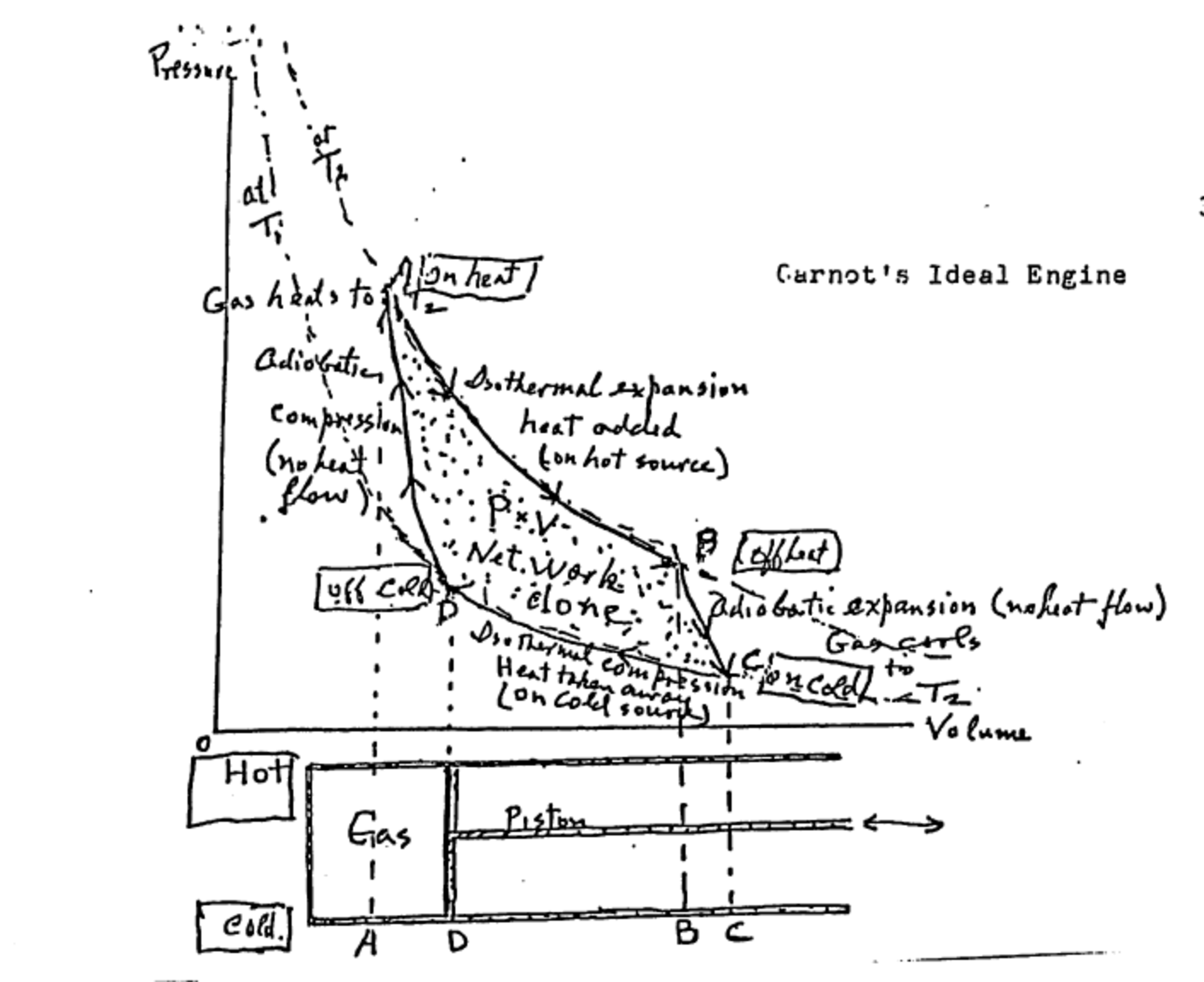 The engine (a piston in a cylinder of gas) is outlined here beneath the graph of its own action above, where the pressure of the gas is plotted against its volume. Each hyperbola of the graph fulfills Boyle’s law, that for an ideal gas, at constant temperature, pressure times volume remains the same. There are two curves, matching the two temperatures over which the engine operates. They exhibit the law of Charles and Gay-Lussac, that pressure times volume varies as Absolute Temperature (pv = T/273). In this engine of pure thought, the likes of which nobody could ever build, we imagine the cylinder as being applied to the source of heat. The piston goes out just fast enough for the absorbed heat to keep the gas, otherwise cooled by [39] expansion, at the same temperature. If we started at A, we follow the graph down the isothermal hyperbola to B, at a larger volume and lower pressure. At B we remove the heat, but let the piston go on out, expanding and cooling the gas (adiabatic, no heat flowing in or out). So it reaches the lower isothermal at C. Here we put the cylinder on the cold source and let the piston move back to the left, condensing the gas. Against its tendency to heat, we refrigerate it just enough to track the isotherm back to point D. There we remove the cold source but let the gas go on being compressed, adiabatic again, no heat flowing in or out; so it warms up until, by ideal management, it returns to point A where it began. Since every change of temperature has been directly associated with a change of volume, this engine has an ultimate efficiency beyond which no actual heat engine can go. And since every area on the graph is pressure times volume, or work, the net work done by the heat flow is simply the shaded area of the trapezoid or queer parallelogram ABCD.