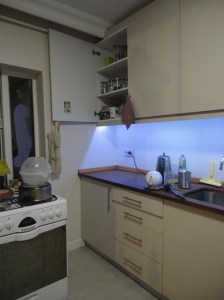 The corner of the kitchen counter cleared for baking. It’s way before dawn, because that’s when I get up. The previous owner had the oven where ours is, and we liked the idea of having a longer counter as a result. We were inclined to have a marble counter put in, but the contractor suggested the teak