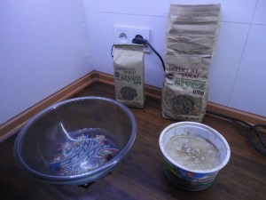 Before I boiled water to refresh the starter, I measured out 200 cc rolled oats. I boiled them in 400 cc water with two heaping small spoons of salt. Maybe that means two teaspoons, but I haven’t got proper measuring spoons. I add the oats, now cool, to the starter.
