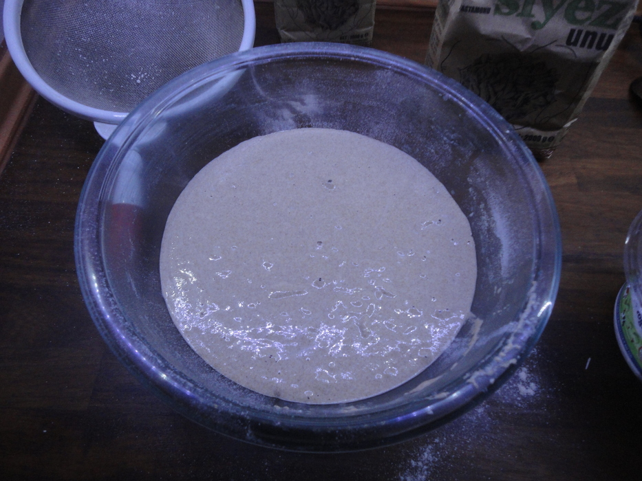 300 cc boiled water, with the starter and the flour I’m going to use. We order the siyez unu directly from İstiklal Yolu. Normally we get it in 2-kg bags (several at a time, along with bulgur, buckwheat, and rice), but last time, apparently the company were trying to use up 1-kg bags