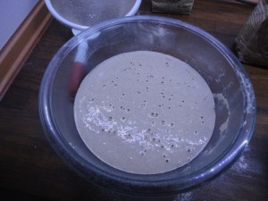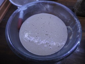 I stir in enough flour that the result looks like this. I add as much flour as I can, while the mix stays liquid. I cover and wait