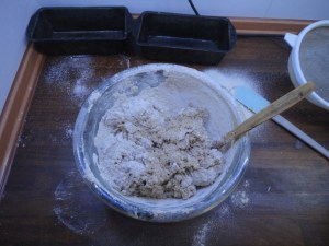 When I figure I’ve poured as much flour from their paper bags as I am going to need, I grease the pans with coconut oil or butter, then get my hands in the dough. Now I cannot take photos. When the dough feels right, I cut it in two with the silicon spatula, roll out each part into a disk, fold it towards me, fold the sides in, then press out into a long rectangle, which I roll towards me. I’ve got water on my hands, not flour. I drop the roll into a pan