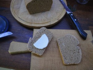 We also baked bread on the farm, for sale at our weekly stands in Washington; but we just followed the boss’s recipe, which was sixteen parts white flour for every five parts of whole wheat, along with molasses to make the bread look browner than it was. There was no kneading, just mixing everything up in a bowl. If the boss saw us using a spoon for this, he would say, “Use your hand!” Then he would demonstrate by sticking in his own unwashed hand.