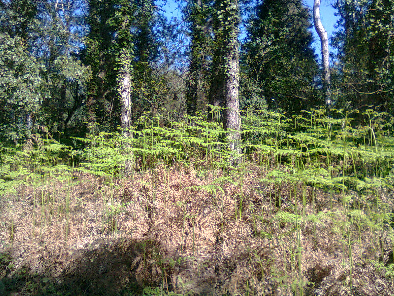 Above brown withered ferns, light green new ones stand on stalks; behind them, trunks of trees