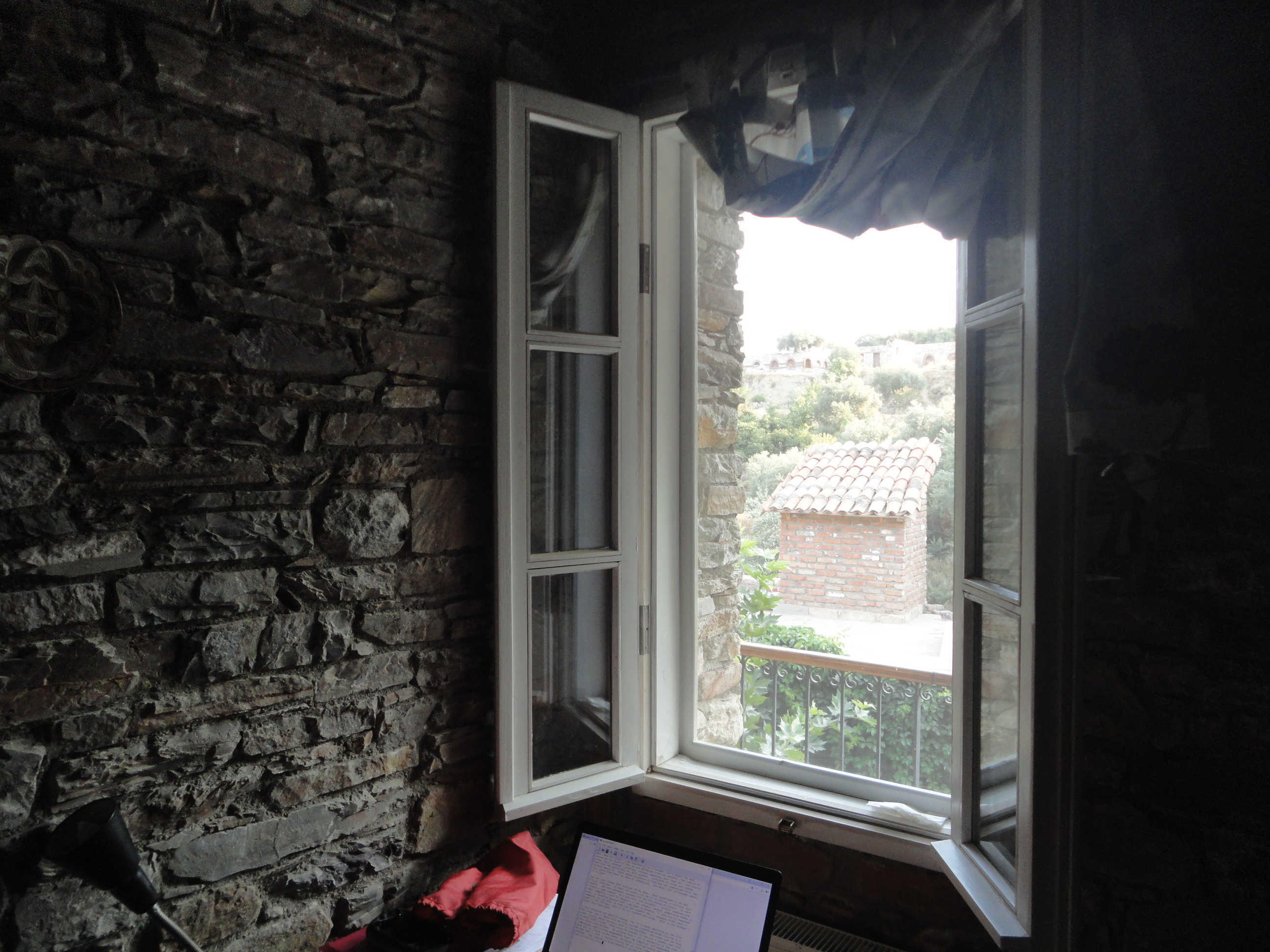 I have effected one material change that is already improving my own life. The rooms that I share with my wife include a bathroom whose ceiling is a tower, rising above the main roof of the building. The room is elegant, and the architect must have had fun, and it is good that he was able to do this work. The tower has two high windows, but both were closed. They could be opened, if one had a ladder or the nerve to climb the walls; but then the open windows would need screens. We already have a lot of mosquitoes in the room. I became a squeaky wheel. I complained, and Village management heard my complaint and responded. Warm air is rising in the tower, bringing a cooling breeze through the window that I face, looking out on olive trees that are buzzing with the one sound that I have no complaint about: the voice of the cicada. The lecture being given to high-schoolers, in the theater out of sight to the left, is not too loud.