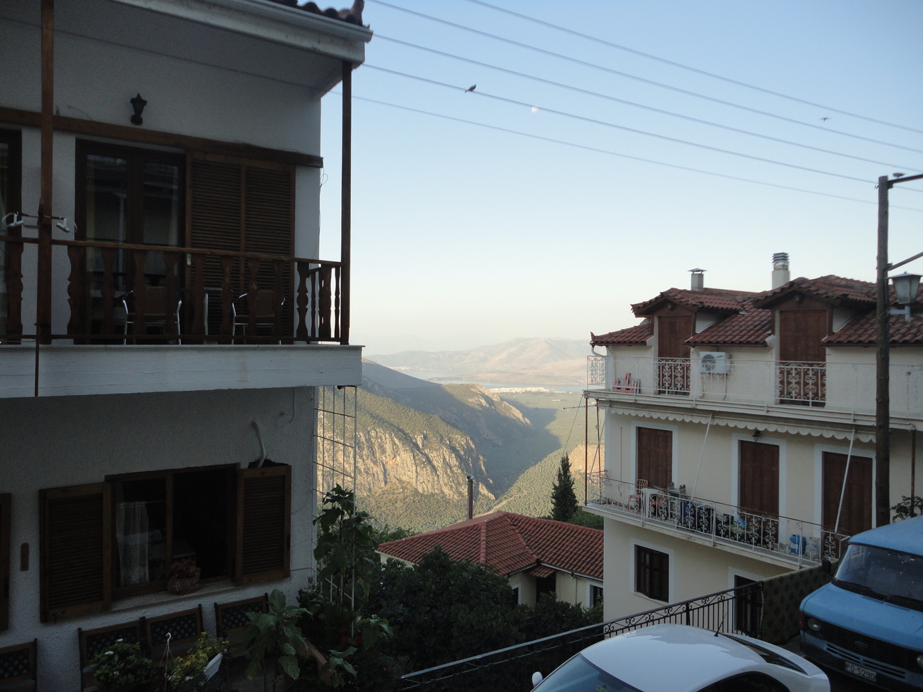 View between two hotel buildings from one mountainside to another, with a bit of the sea beyond