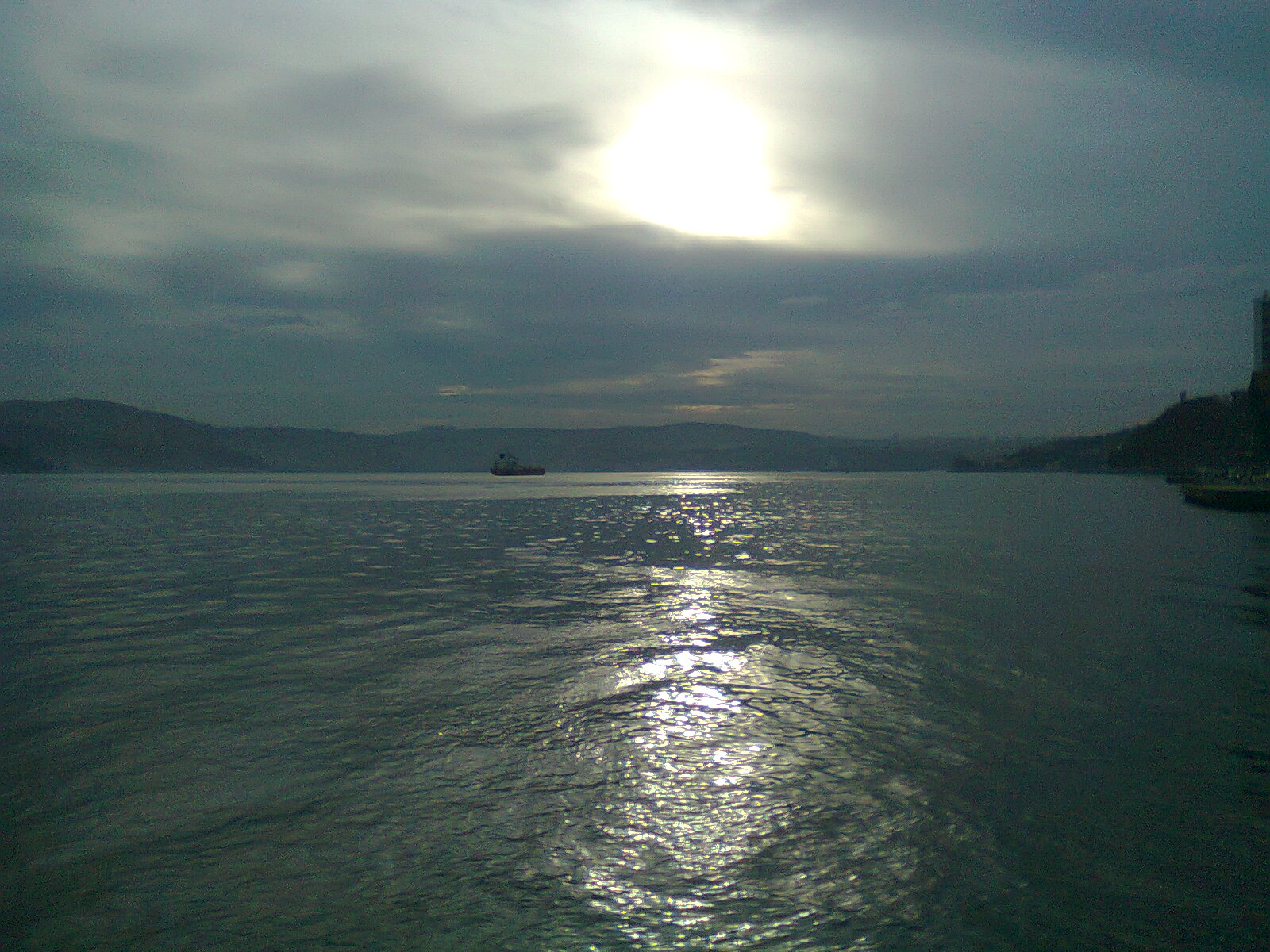 Morning sun, obscured by overcast skies, still shines on waters in turmoil in the Bosphorus Strait