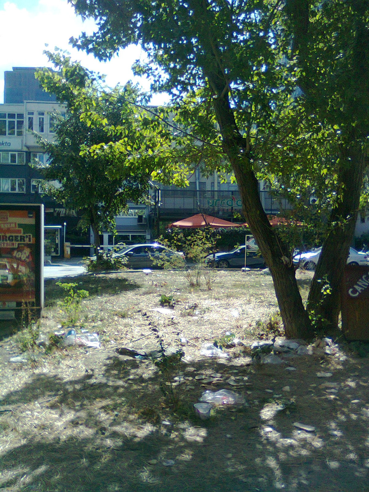 Mostly bare earth with a few weeds, some trash, a tree with two trunks, and a billboard; cars and low-rise buildings behind, on a sunny day